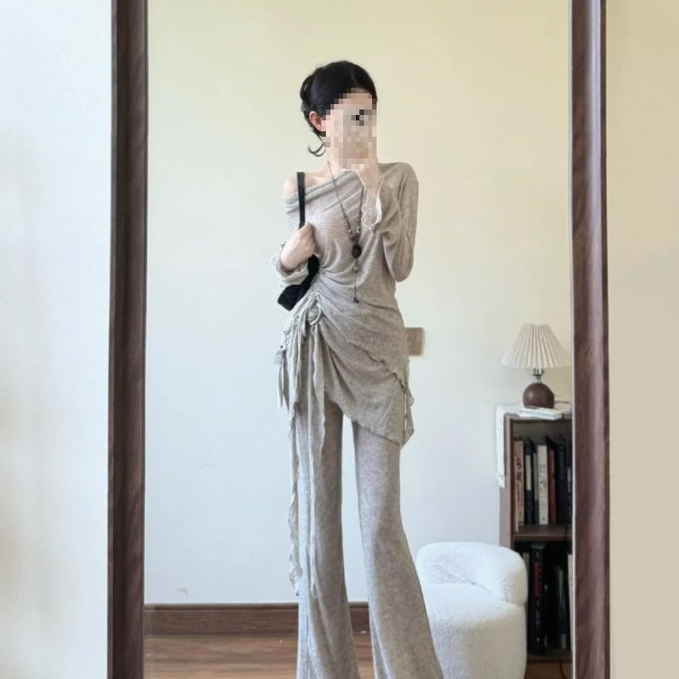 Baju Atasan Wanita Bahu Miring Gaya Malas Setelan Celana Panjang Mikro-Lok Tidak Beraturan Musim Panas 2025 Kasual Mudah Dipadu Padan Ukuran Besar Gaya Korea