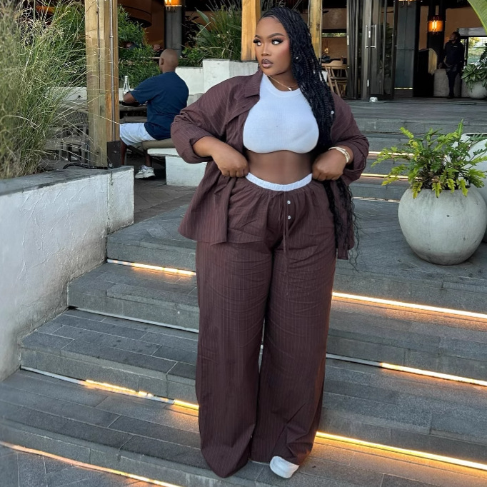 Kardigan Warna Kontras Garis Pinggang Tinggi Kasual Ukuran Besar Eropa Amerika Kemeja Celana Panjang Pakaian Wanita Gaya Barat Afrika Setelan Dua Potong Longgar Wanita