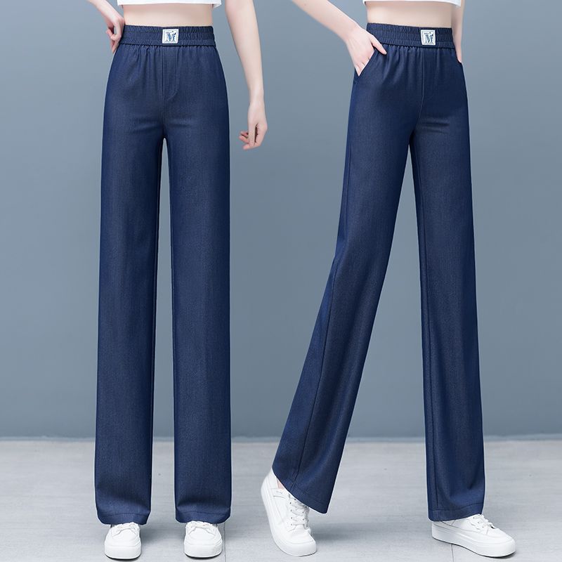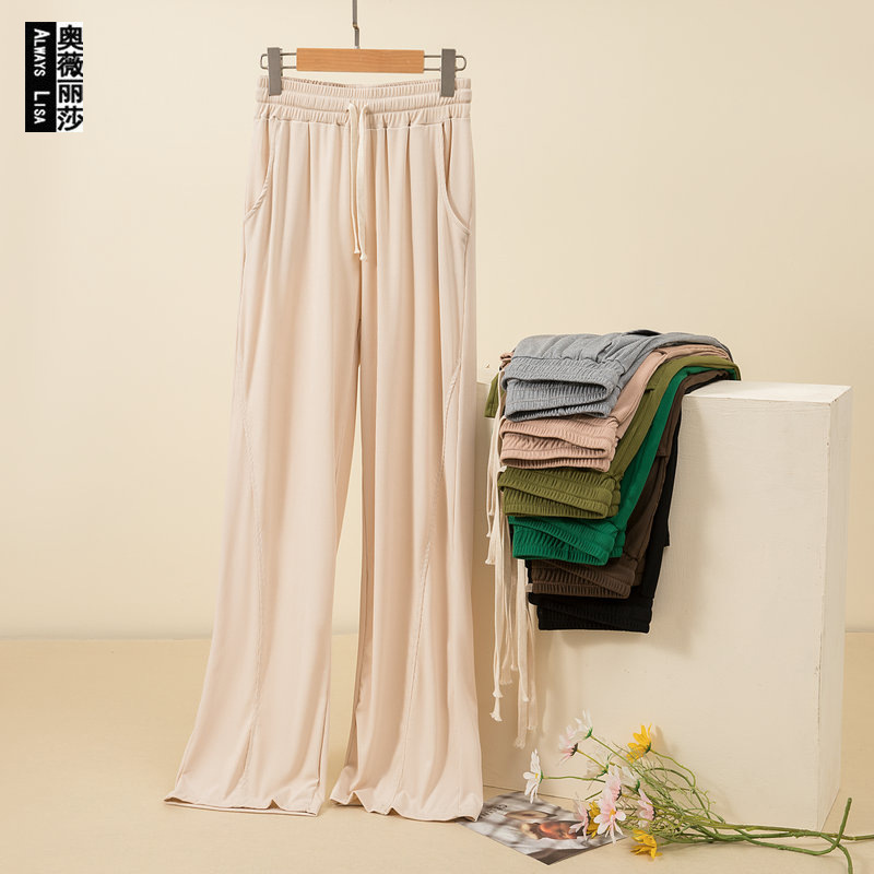 Celana panjang kasual model modal benang 2023 celana kaki lebar bersaku pinggang tinggi musim panas celana panjang tipis model lurus terlihat ramping ukuran plus