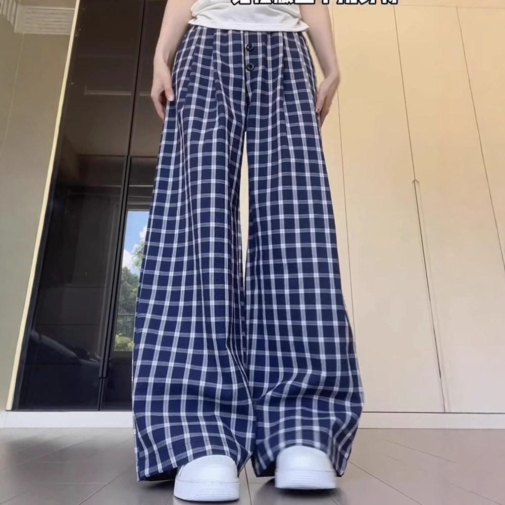 Dongdaemun Korea Musim Semi dan Musim Panas Model Baru Retro Biru Kancing Pinggang Tinggi Celana Kasual Wanita Longgar Pel Kaki Lebar