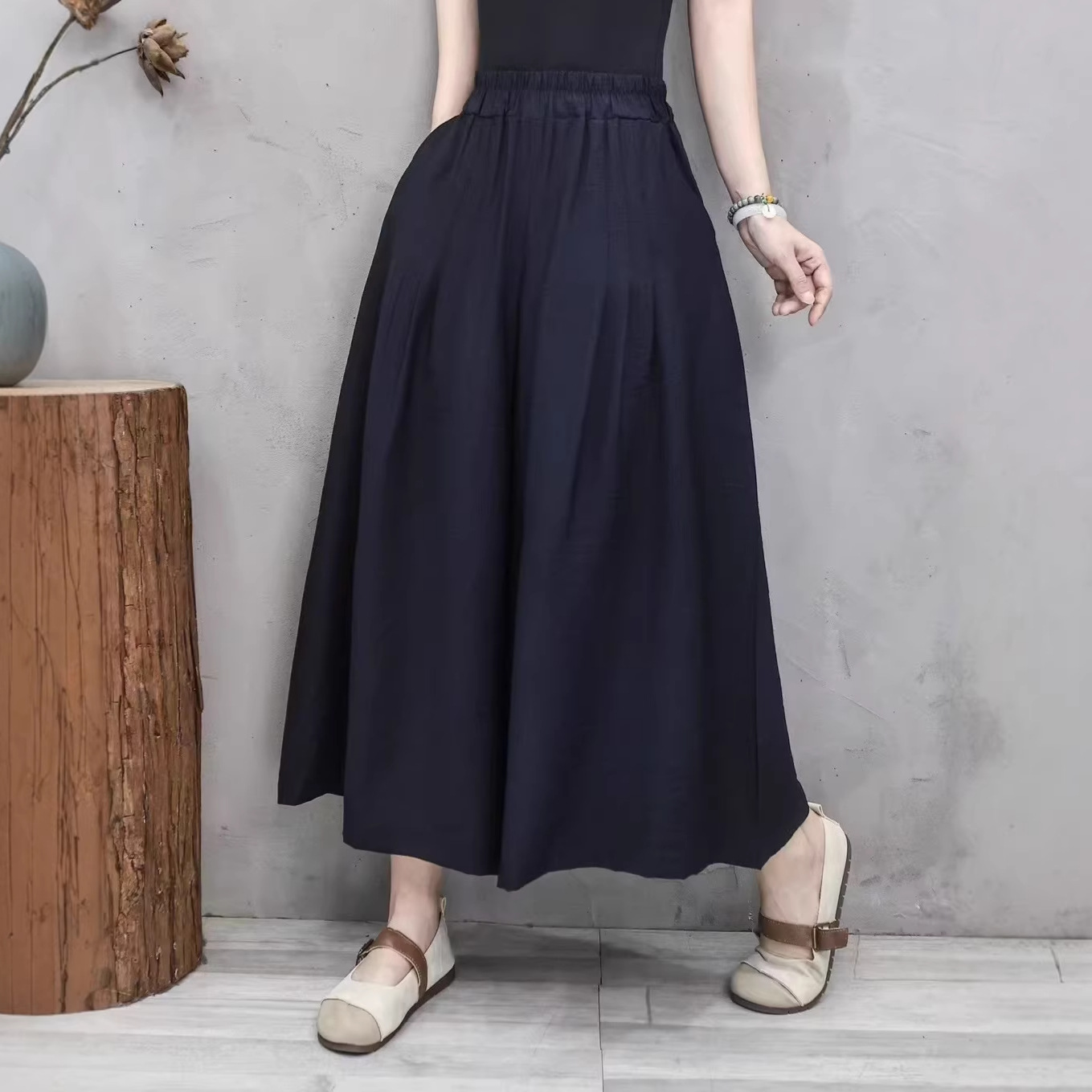 Foto Padat Musim Panas 2025 Model Baru Katun dan Linen Warna Solid Ukuran Besar Gaya Seni Menutupi Kaki Lebar Rok Celana Wanita