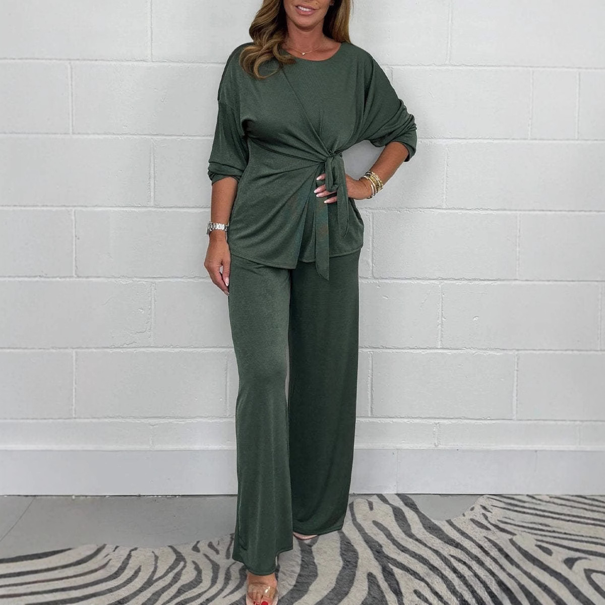 Pakaian Wanita Musim Gugur 2024 Lintas Batas Eropa Amerika Amazon Atasan dan Celana Panjang Lengan Panjang Bertali Modis Kasual Warna Polos
