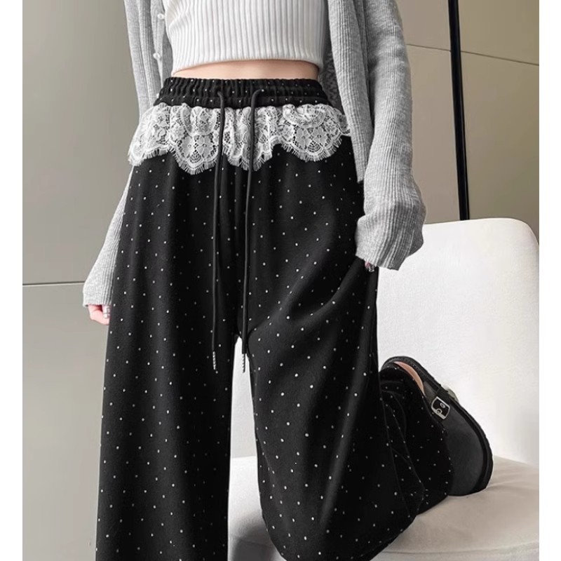Celana Panjang Kaki Lebar Olahraga Renda Berenda Warna Abu-Abu Celana Santai Terlihat Langsing Pinggang Tinggi Model Baru Musim Semi 2025 Wanita