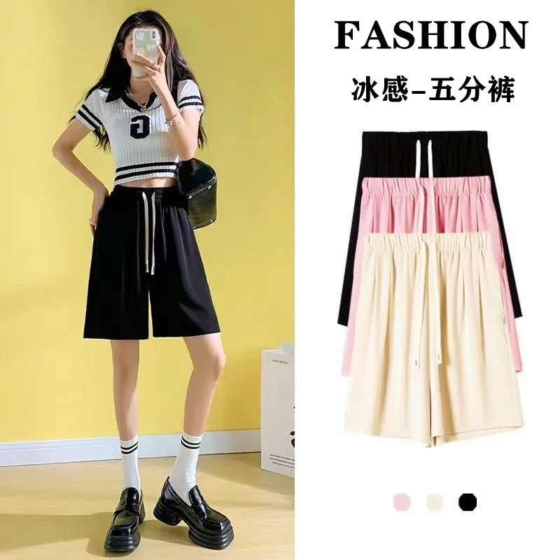 Setelan celana pendek hitam untuk wanita, celana pendek musim panas pinggang tinggi pelangsing longgar kasual es sutra kecil ukuran plus a-line celana 5 poin