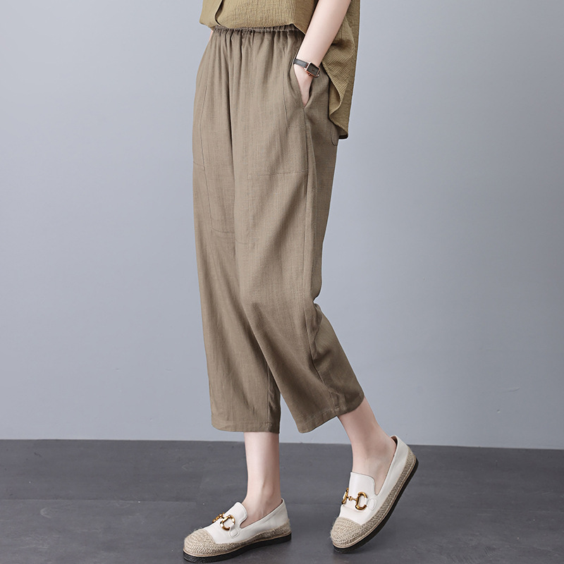 Celana katun linen musim panas celana wanita celana crop kasual longgar ukuran besar celana lobak celana wanita celana harem olahraga pinggang elastis