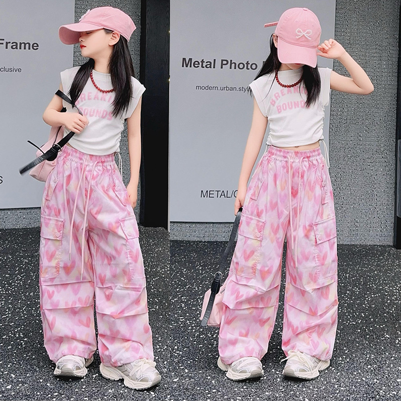 Set Celana Kargo Anak Perempuan Musim Panas Celana Panjang Hati Longgar Cetak Tank-top Tali Serut Dua Set Model Baru 2024