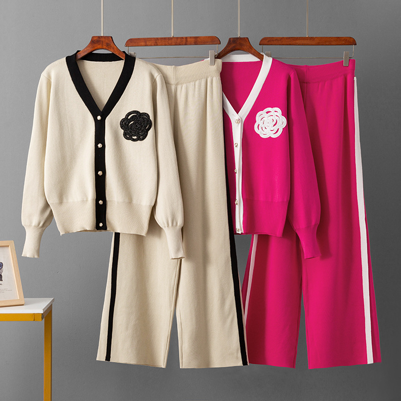 Setelan Kasual Kerah V Musim Semi Eropa dan Amerika Lintas Batas Atasan Rajutan Kardigan Modis Wanita Celana Kaki Lebar Slim Fit Dua Potong