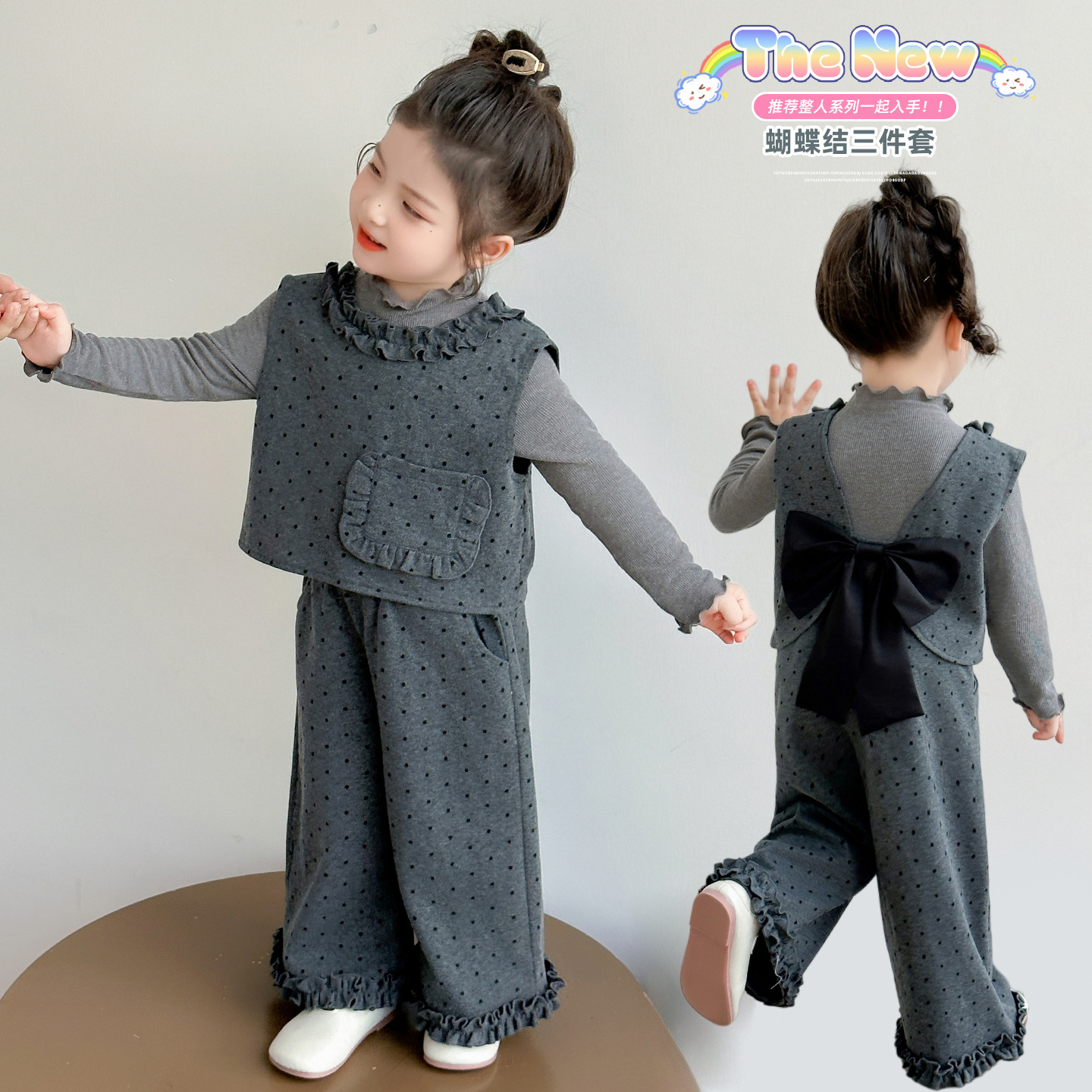 女童套装春秋装洋气儿童圆点背心打底衫阔腿裤三件套宝宝时髦衣服