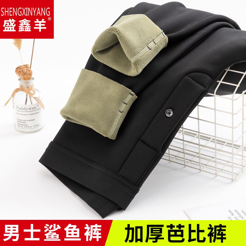 Celana panjang pria, bawahan Barbie sepeda motor, celana hangat bergaris bulu domba slim fit, Legging dipertebal pinggang tinggi, celana hiu musim gugur dan musim dingin