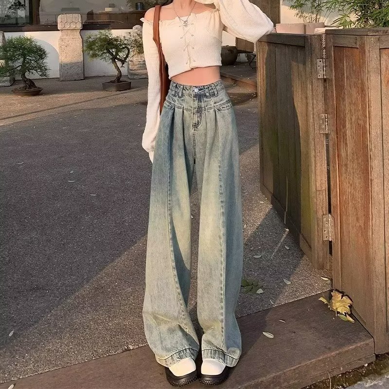 Celana Jeans Wanita Kaki Lebar Pinggang Tinggi Model Baru 2023 Wanita Longgar Lipit Terlihat Langsing Celana Lurus Pas Badan
