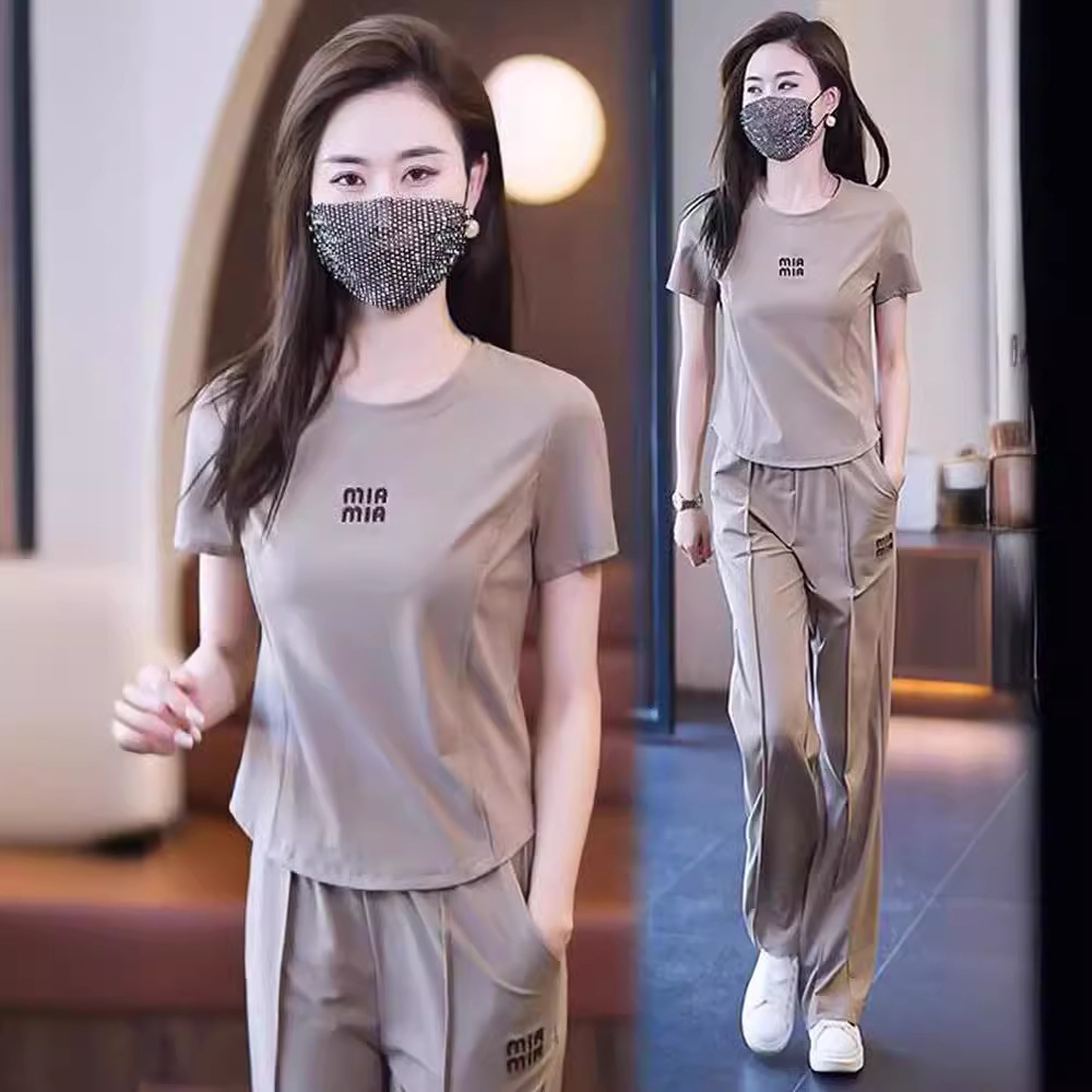 Kaus wanita lengan pendek, pakaian olahraga kasual dua-potong kecil, Kaus bottoming lengan pendek, setelan celana kaki lebar longgar untuk wanita