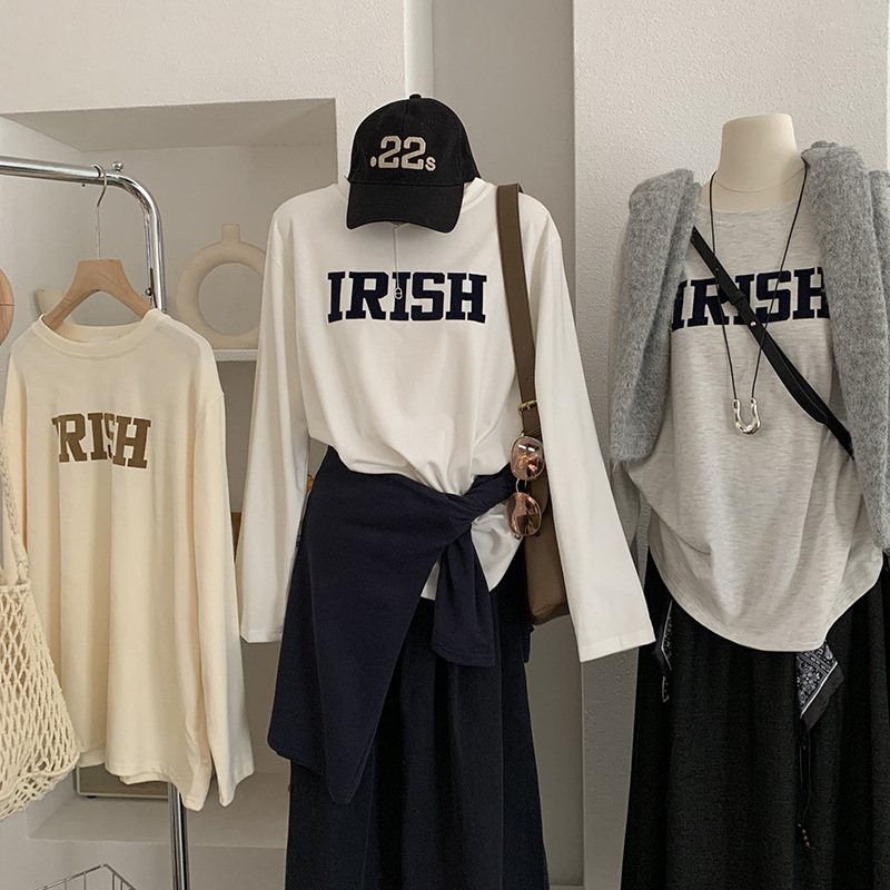 欧玛莱 字母植绒印花圆领长袖宽松中长款内搭T恤打底衫上衣女4554