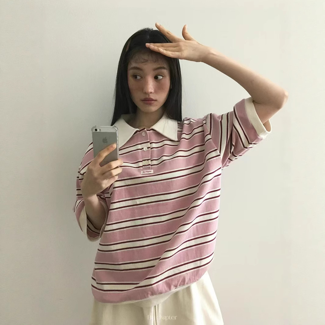 READY 2025 Musim Semi dan Musim Panas Model Baru Warna Kontras Longgar Kasual Bergaris Polo Kerah Baju Rajut Lengan Pendek Wanita Atasan
