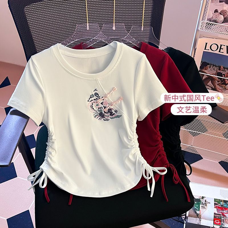 T-Shirt Wanita Lengan Pendek Bordir Gaya Nasional Industri Berat Musim Panas 2025 Model Baru Longgar Terlihat Kurus Tali Serut Wanita Ukuran Kecil