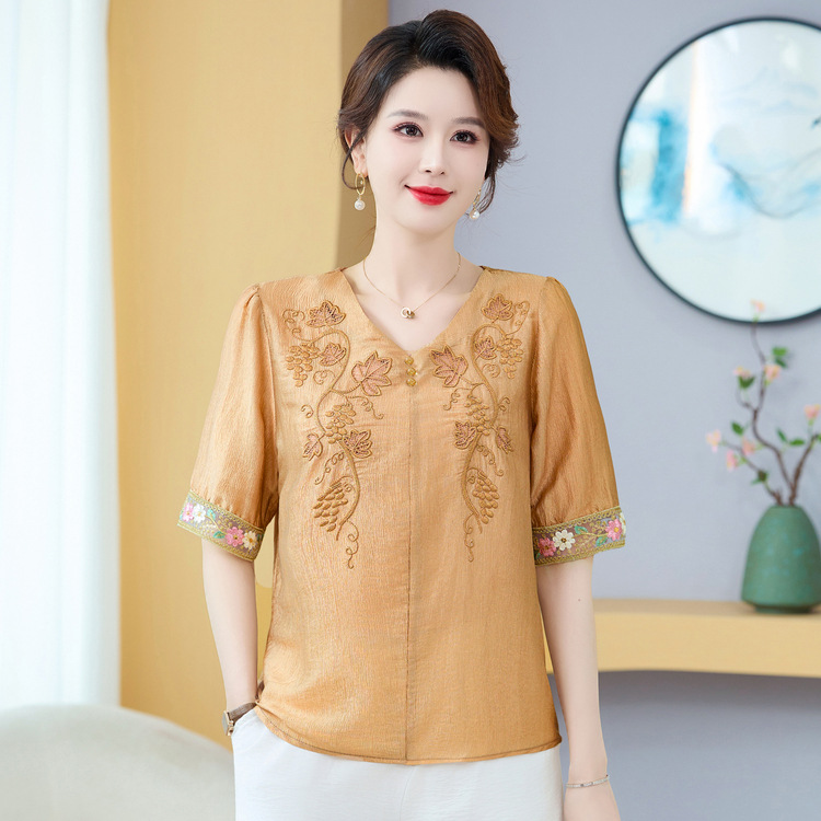 Kaos Lengan Pendek Gaya Reproduksi Musim Panas Ibu Kemeja Bordir Kerah V Terlihat Langsing Longgar Setengah Baya Kemeja Atasan Wanita