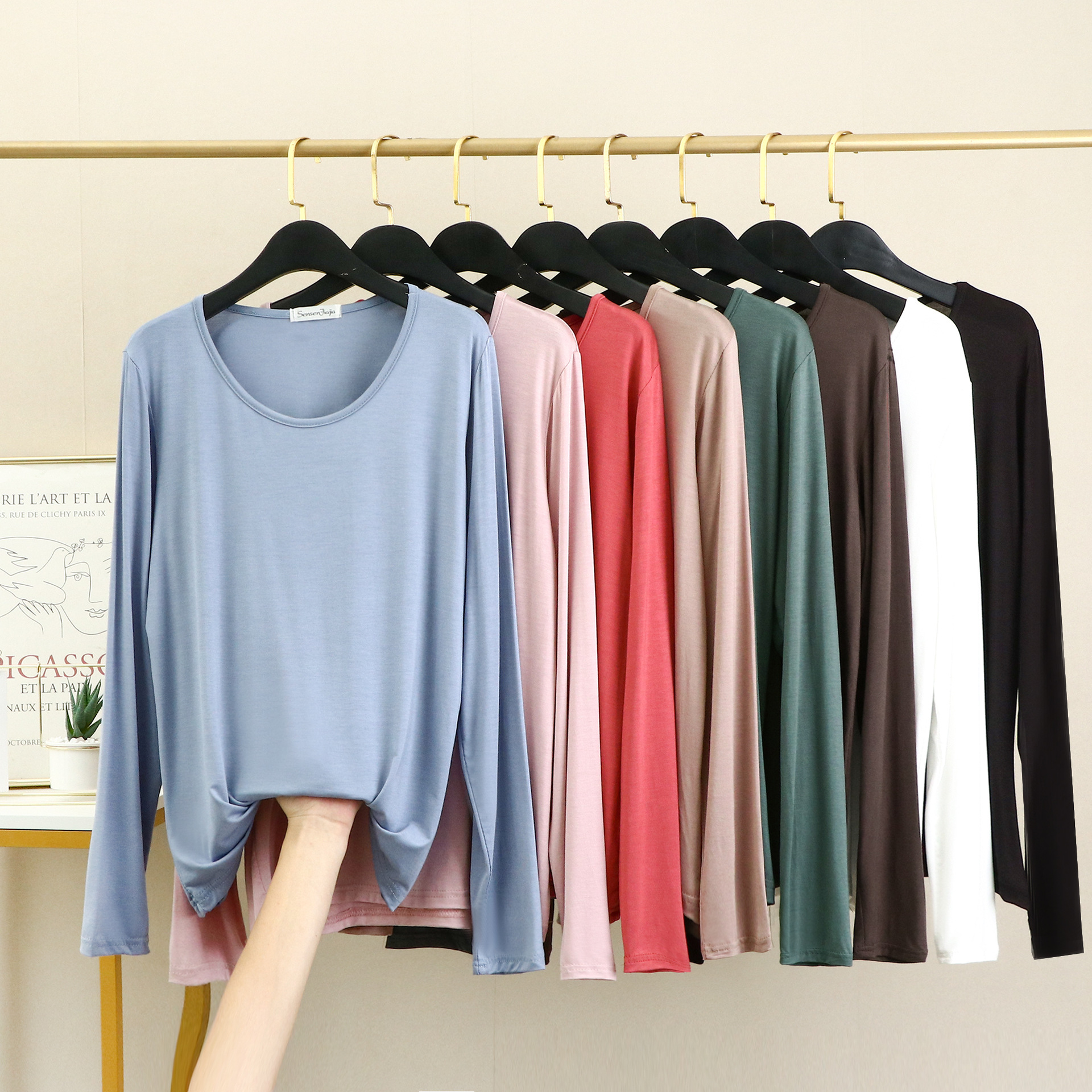 Modal kemeja Dalaman lengan panjang wanita, pakaian dalam ramping warna polos leher bulat ukuran besar musim semi dan musim gugur