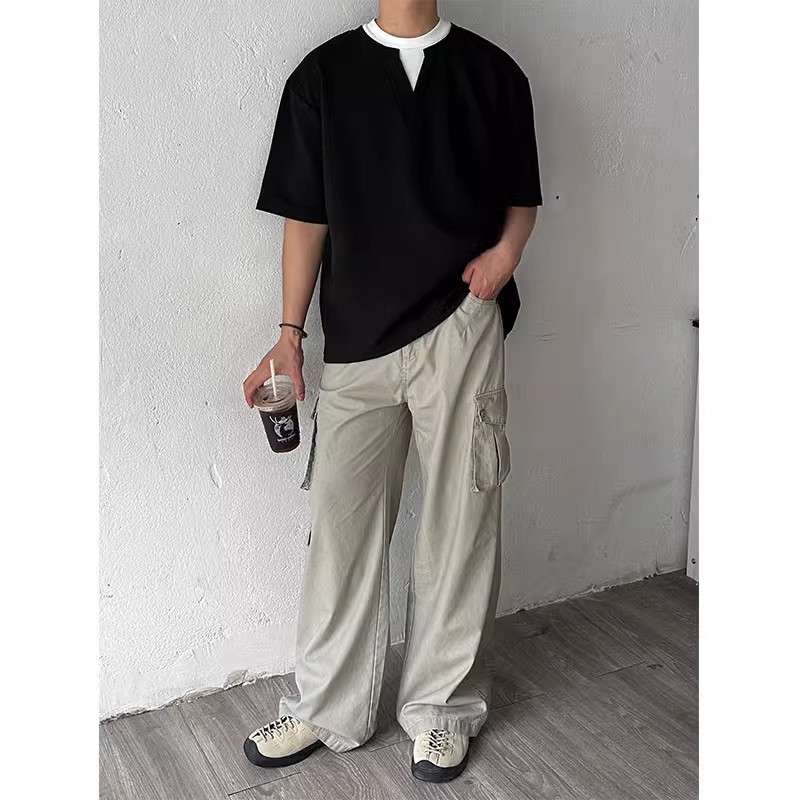 Kaus Lengan Pendek Dua Potong Palsu Warna Kontras Desain Niche Musim Panas 2025 Atasan Lengan Setengah Kerah V Sambung Longgar Mudah Dipadu Padan Pria Trendi