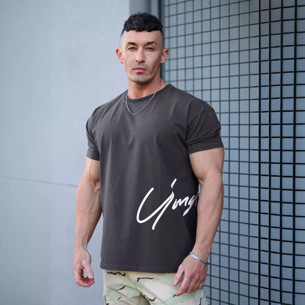 Olahraga Otot Longgar Bahan Katun Kebugaran Lengan Pendek Pria Bola Basket Musim Gugur Berlari Pelatihan Bahan Katun T-shirt Olahraga Kerah Bulat