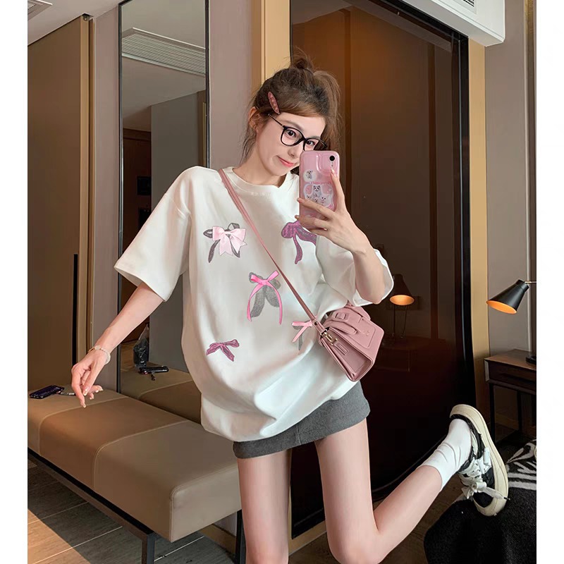 Kaus Lengan Pendek Pita Kupu-Kupu Atasan Modis Mudah Dipadu Padan Manis Pria Kecil Musim Panas 2024 Wanita Super Tampan