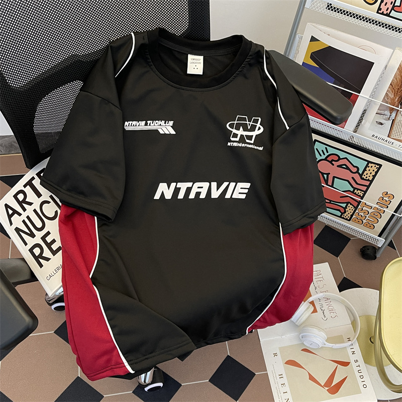 [Tersedia di pabrik sendiri] Kaos Longgar Lengan Pendek Motif Huruf Atasan Kerah V Baju Olahraga Musim Panas