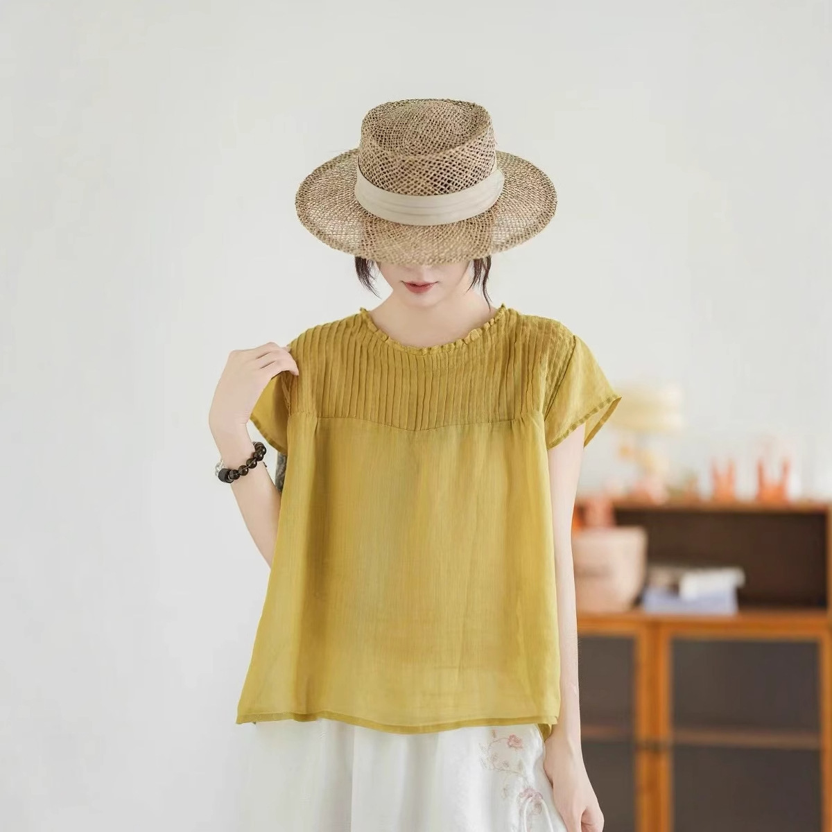Kaus Lengan Kecil Fly Lipit Gaya Sastra dan Seni Ramie Mengurangi Usia Versi Korea Musim Panas 2025 Kaus Kecil Mudah Dipadu Padan Wanita 1829