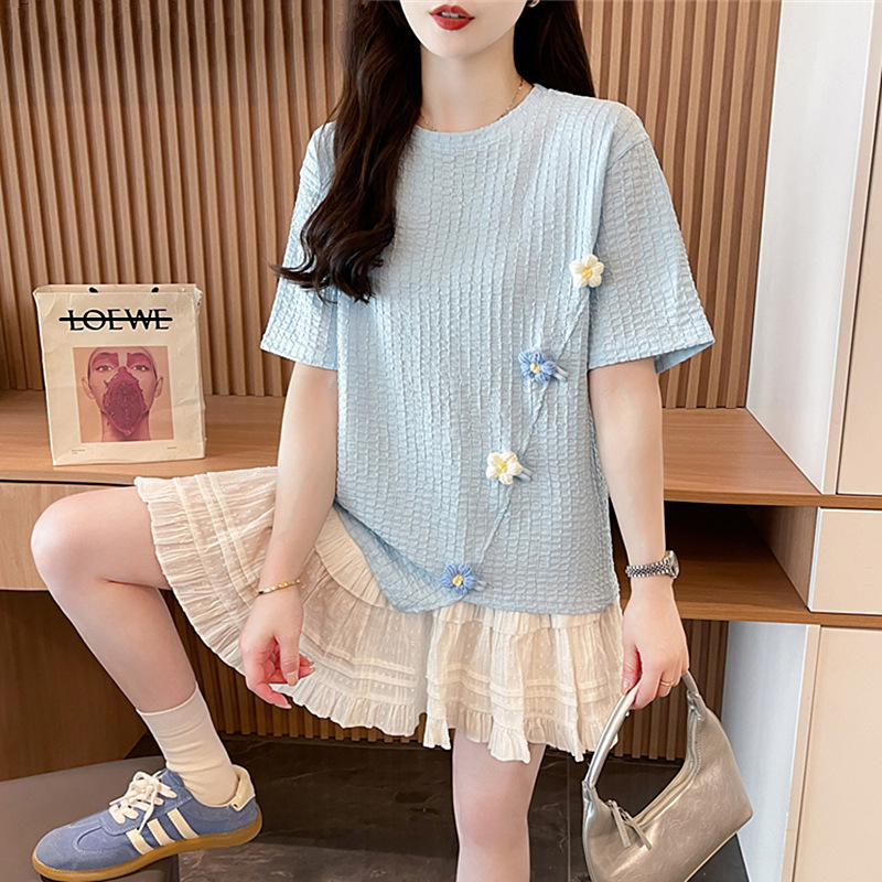 Kaus lengan pendek motif bunga kecil jahitan gaya Korea 2024 atasan pelangsing longgar wanita ukuran plus Musim Panas 68816