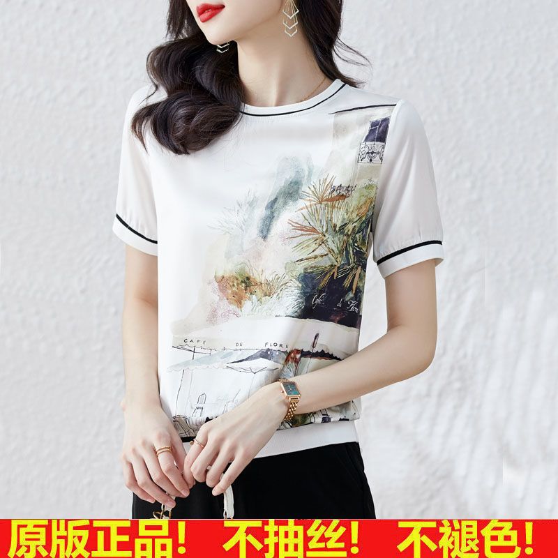 T-shirt Sutra Es Lengan Pendek Wanita Musim Panas 2024 Pakaian Ibu Model Baru Kerah Bulat Gaya Barat Pakaian Wanita Ukuran Besar Atasan Terlihat Langsing Gadis Gemuk
