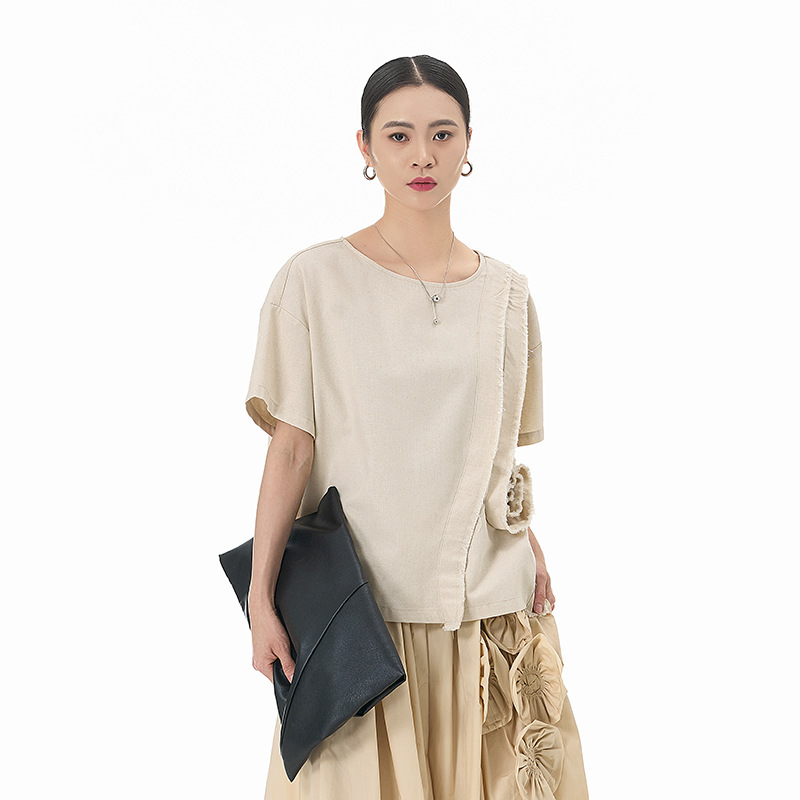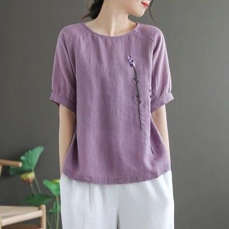Kemeja Lengan Pendek Model Tipis Model Baru Musim Panas Kaos Bordir Ukuran Besar Longgar Retro Wanita Atasan Katun Linen Lintas Batas