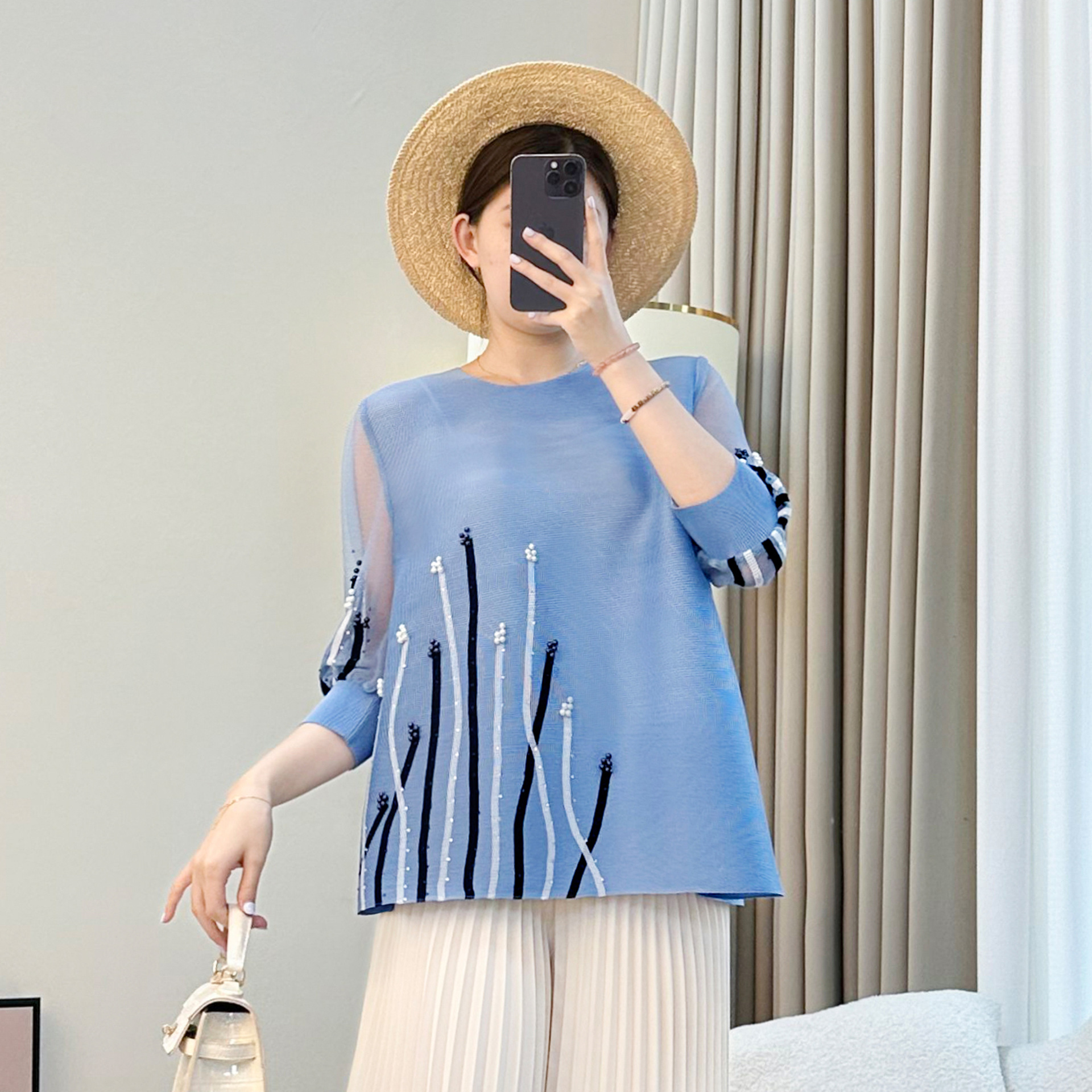 Pakaian Lipit Ukuran Besar Longgar Model Baru Musim Gugur 2024 Atasan Wanita Lengan Kelelawar Kaos Tusuk Gigi Lipit Asia Tenggara Perdagangan Luar Negeri