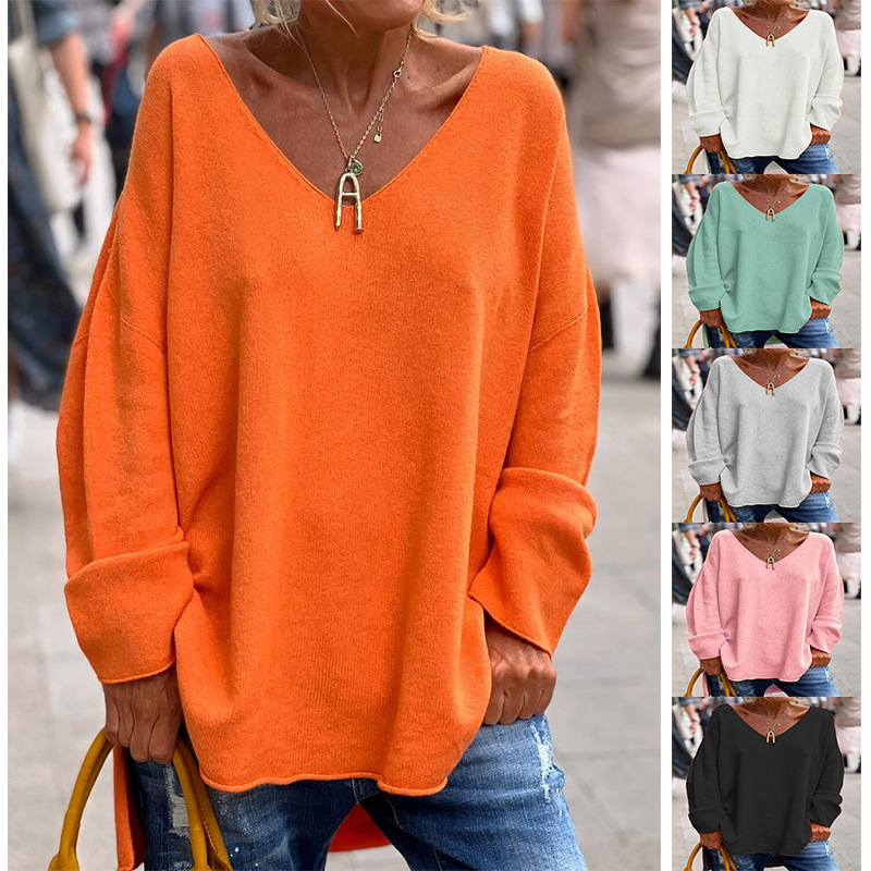 Atasan kaos kasual nyaman leher V, pakaian wanita perdagangan luar negeri lintas batas Eropa dan musim dingin baru musim gugur dan musim dingin 2023