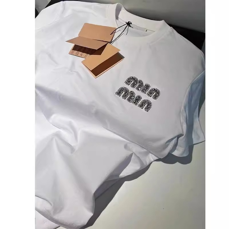 Baju Atasan Kasual Longgar Gaya Eropa Model Baru 2024 Musim Panas Wanita T-Shirt Lengan Pendek Huruf Warna Putih Bertabur Berlian