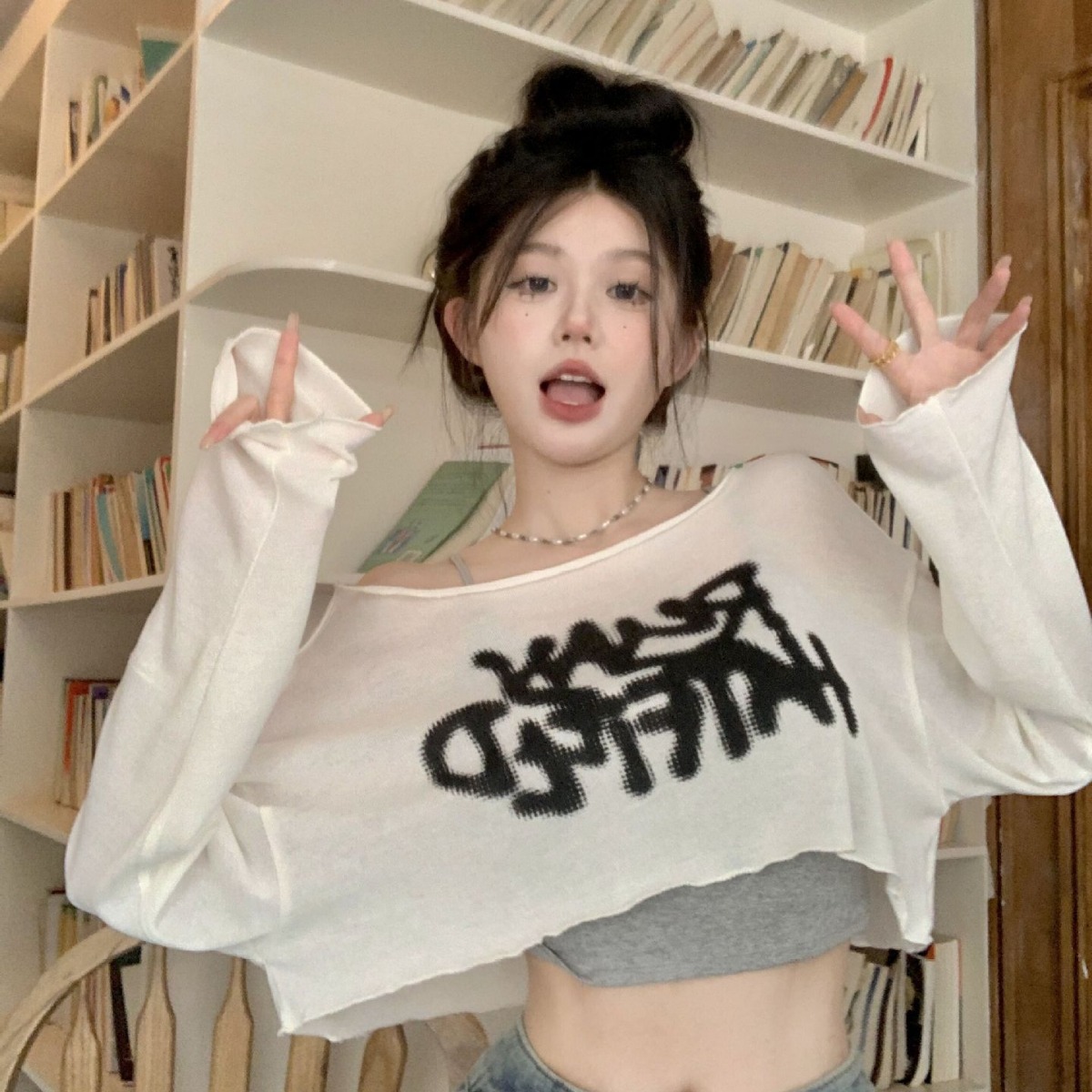 Kaus lengan panjang wanita, blus desain grafiti malas putih pelindung matahari tipis musim gugur pakaian luar atasan pendek longgar