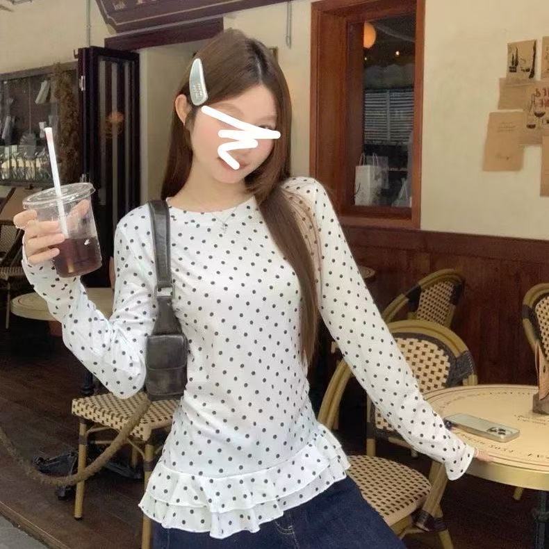 温柔风荷叶边波点长袖T恤女装秋季甜辣小众百搭修身显瘦绝美上衣