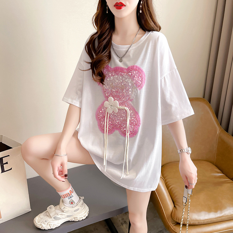 欧玛莱 磨毛卡通小熊印花圆领短袖T恤女2025秋季新款韩版百搭4559