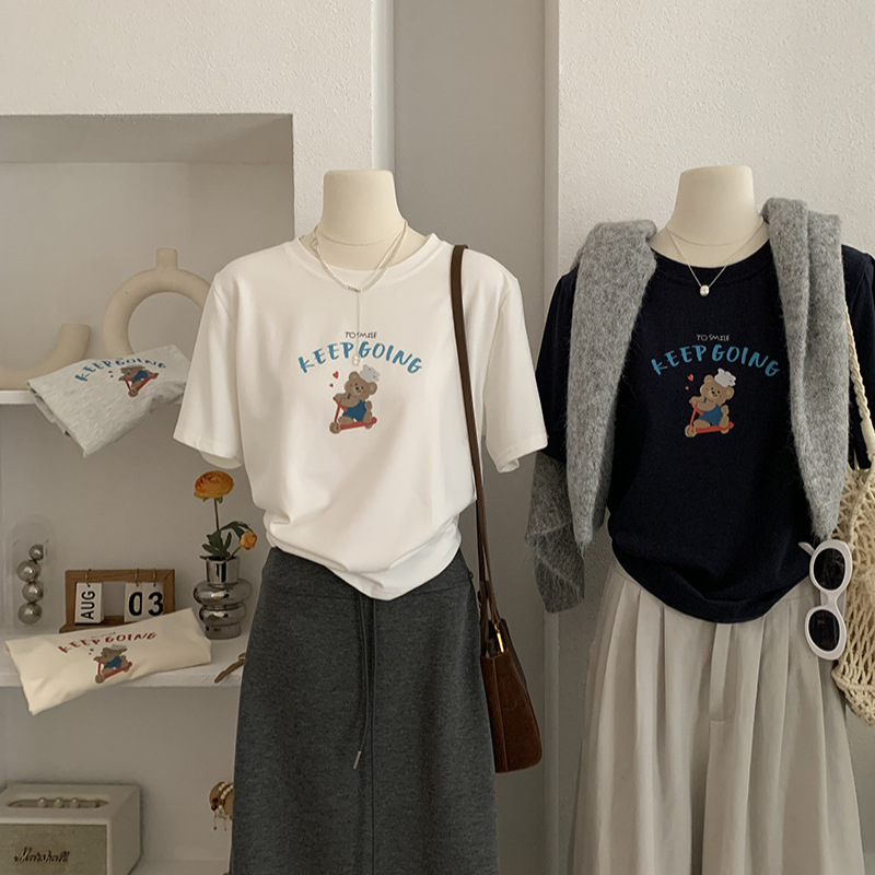 2025秋季新款小众设计师字母小熊印花圆领纯棉修身短袖T恤女