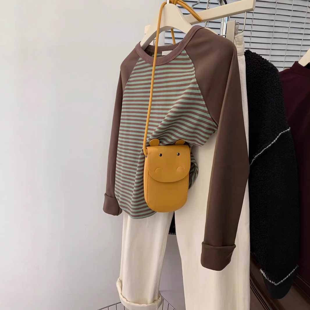 条纹插肩长袖t恤女学生春秋季设计感内搭打底衫显瘦正肩体恤上衣