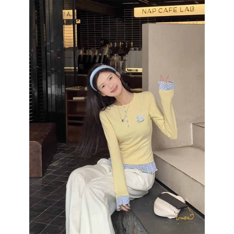 【原版做工】奶黄色假两件长袖T恤女春2025年小个子修身内搭打底