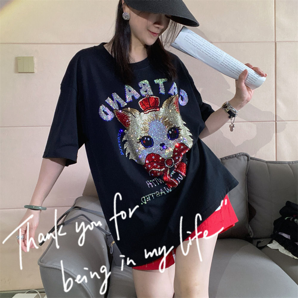 Kaos Wanita Lengan Pendek Warna Hitam Atasan Katun Murni Berlian Panas Merek Trendi Gaya Amerika Model Panjang Sedang Model Besar Produk Eropa Model Longgar Modis Musim Panas