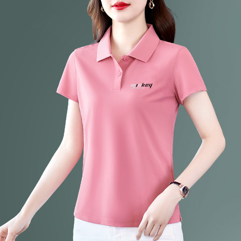 Polo kaus Wanita lengan pendek, kaus lengan pendek lapel 2023, pakaian olahraga ibu usia sedang, atasan longgar kasual ukuran plus musim panas