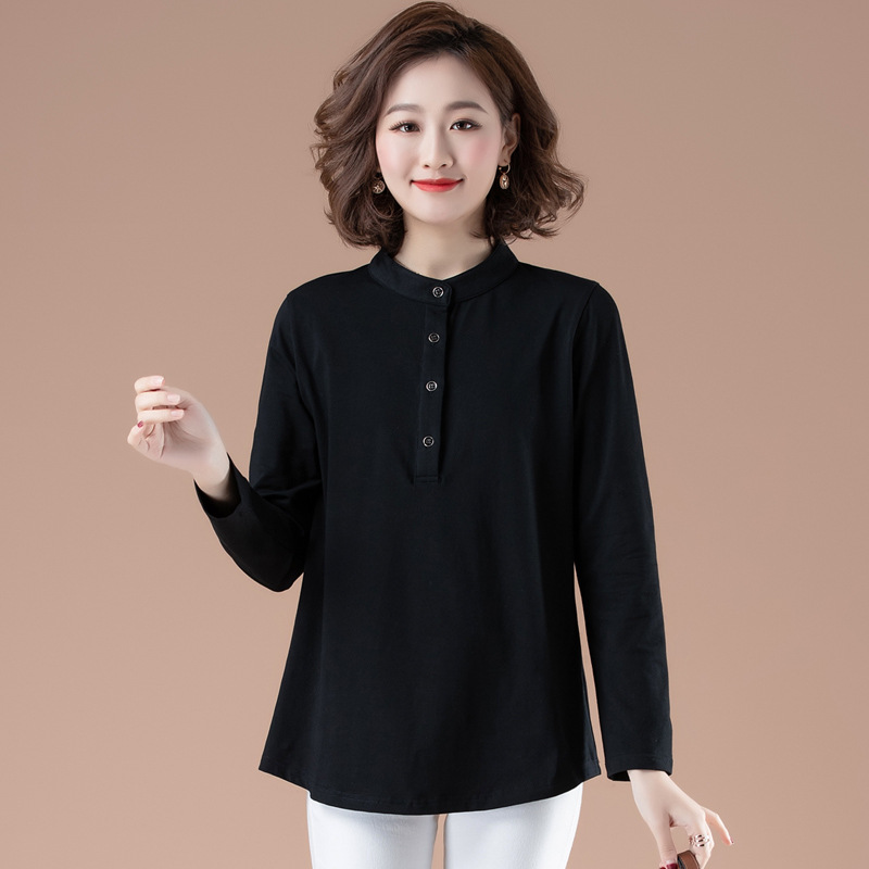 Kaus katun lengan panjang wanita, baju atasan katun longgar ukuran besar bottoming musim semi dan musim gugur kerah berdiri gaya Barat