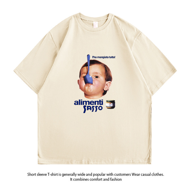 Kaus lengan pendek motif potret retro Amerika atasan desain ceruk cantik lengan pendek aprikot ukuran ekstra besar longgar