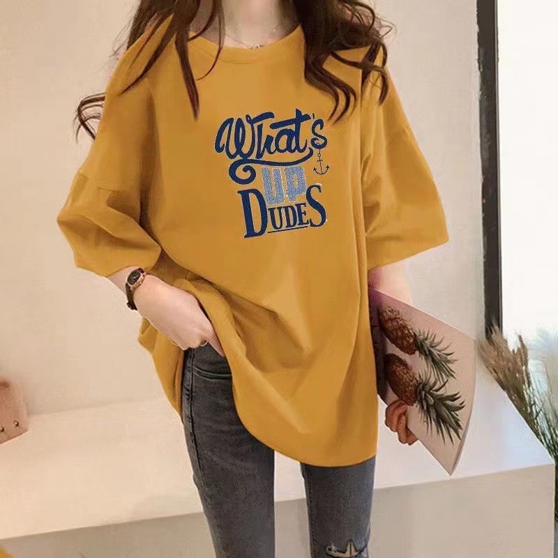 Kaus Lengan Pendek Kunyit Kaus Lengan Setengah Longgar Ukuran Besar Model Eropa Retro Gaya Musim Panas Wanita Atasan Panjang Sedang Instagram Trendi
