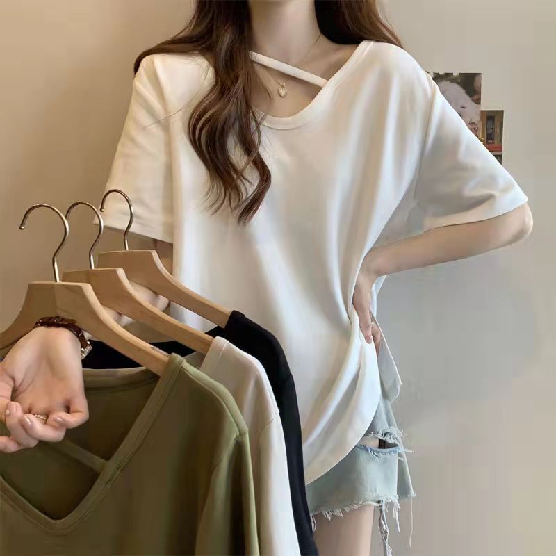 T-shirt Lengan Pendek Kemeja Bottoming Musim Panas Wanita Atasan Model Baru 2023 Longgar Terlihat Kurus Ukuran Besar Desain Bercabang