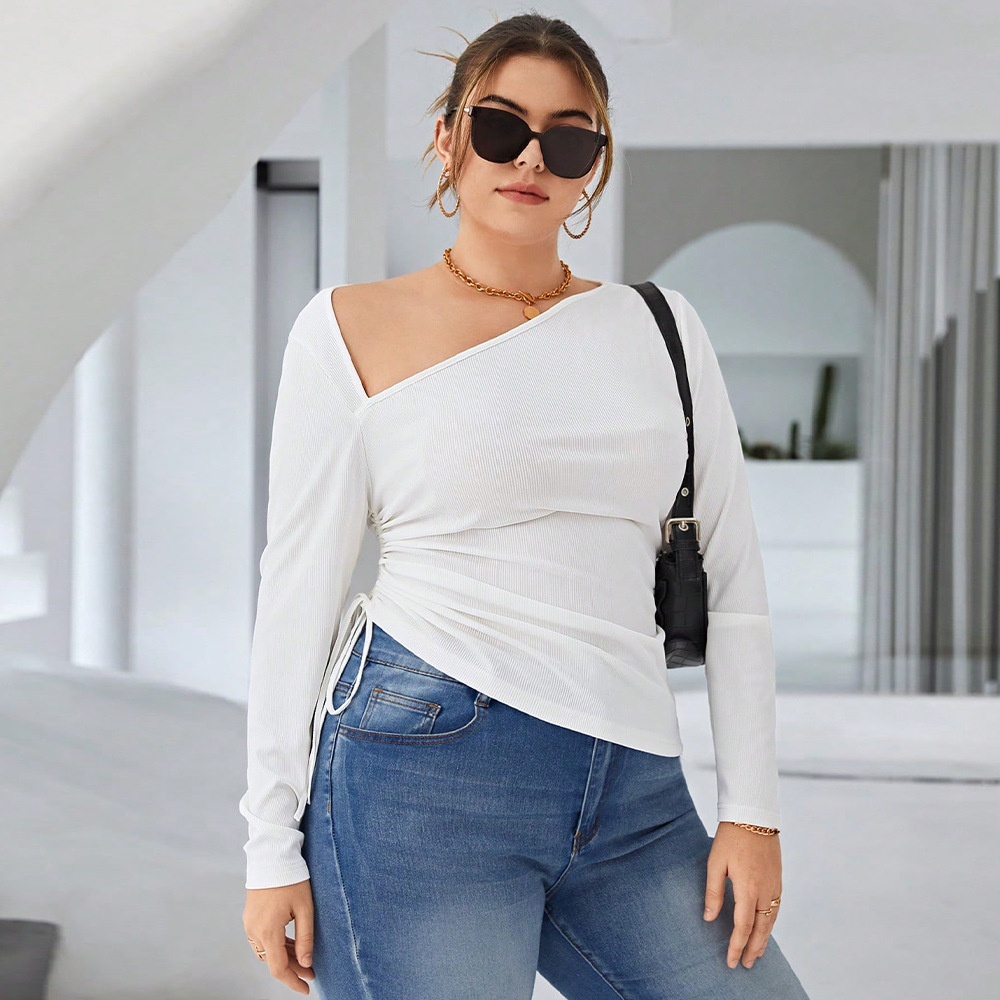 Cross-border kaus bahu terbuka wanita, atasan lipit tidak beraturan lengan panjang slim-fit elegan kelas atas ukuran besar Eropa dan Amerika