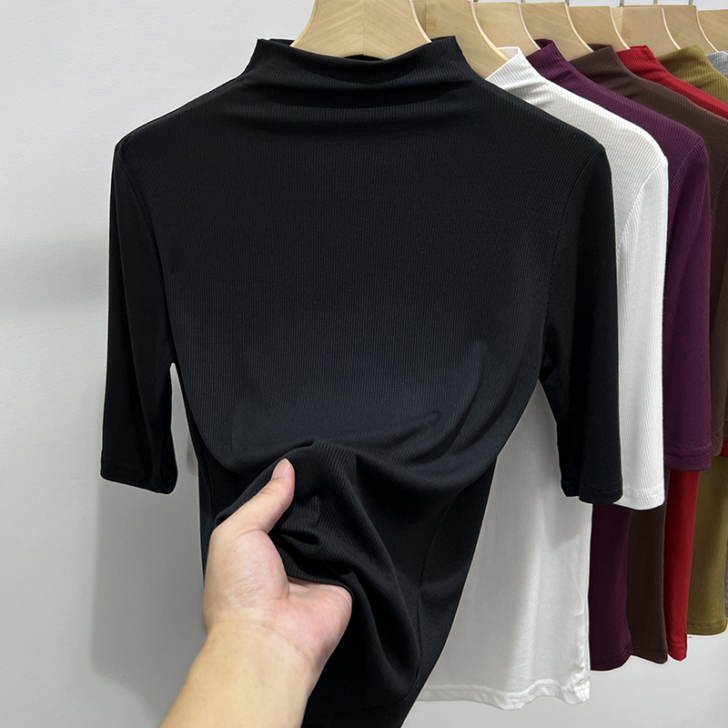 Benang Modal T-shirt setengah turtleneck lengan setengah tipis musim semi dan musim panas Atasan musim gugur ukuran besar chubby gadis musim semi dan musim gugur 3/4 lengan Dasar