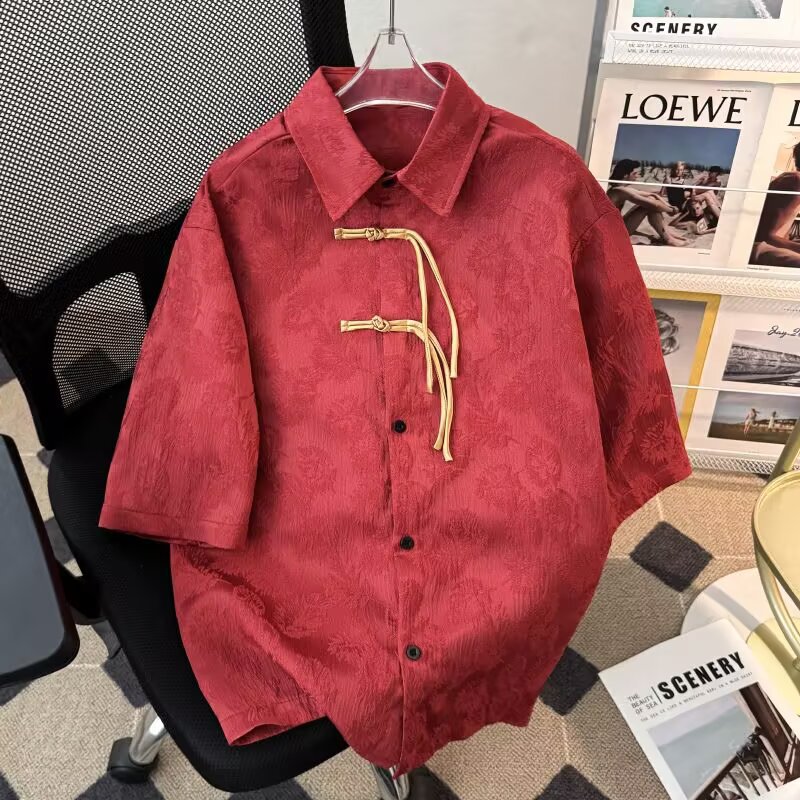中国风夏季新款提花半袖盘扣衬衣男士宽松设计感潮流百搭衬衫跨境