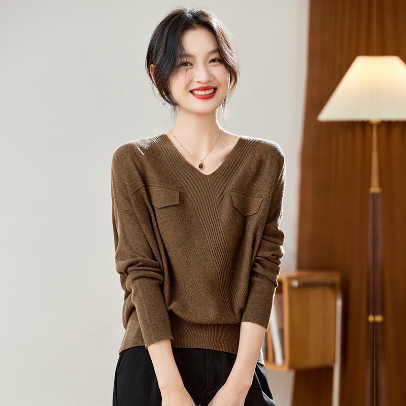 跨境秋冬新款欧美复古长袖上衣宽松设计感翻V领套头女针织衫毛衣