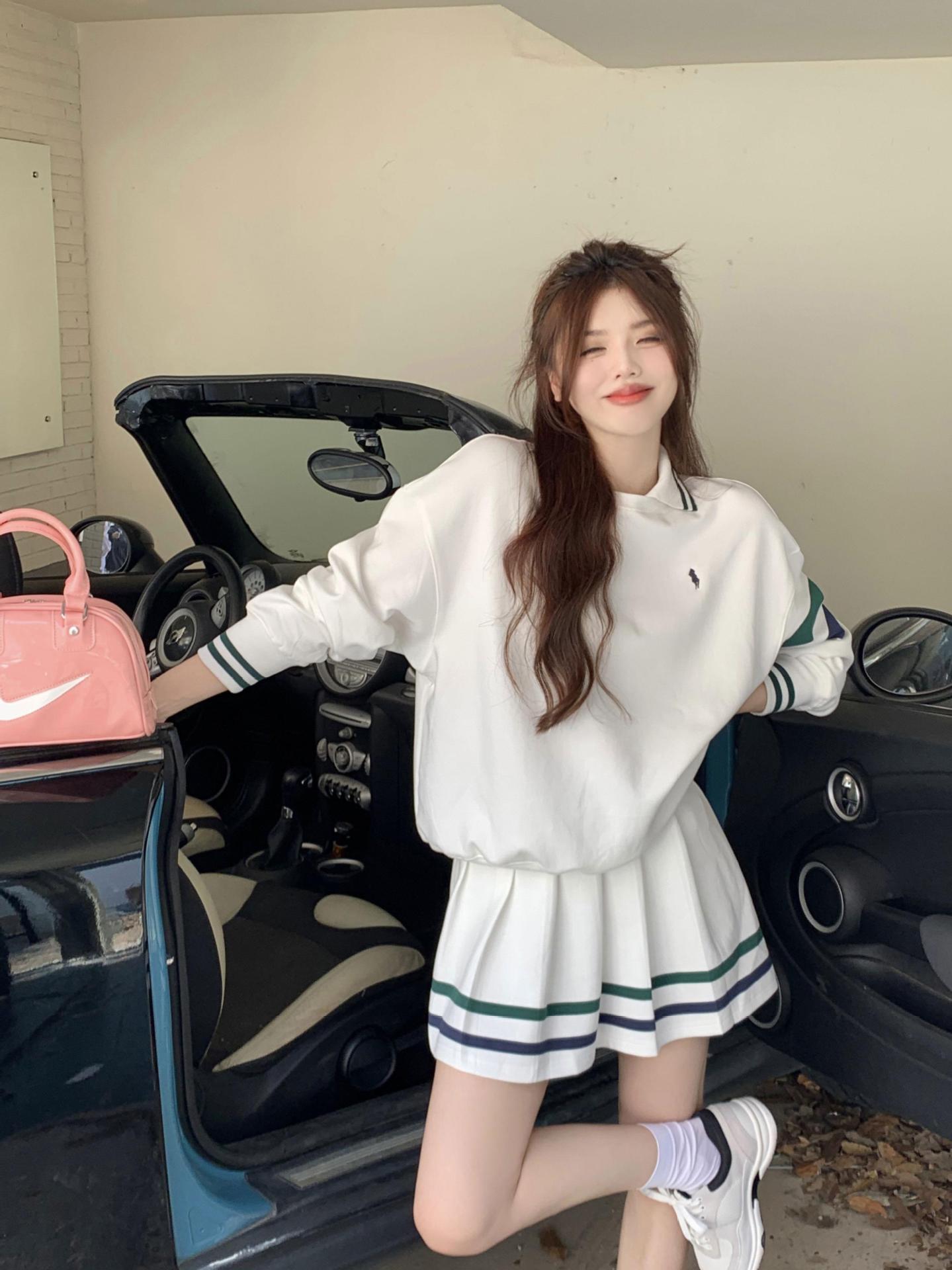 裙子有内衬 条纹运动polo领卫衣女早秋美式复古长袖白色辣妹宽松