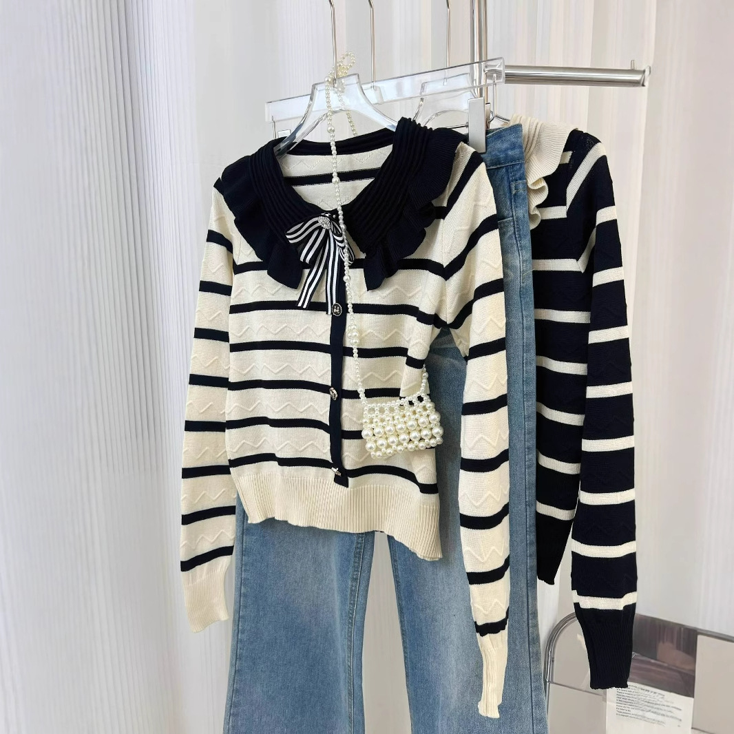 Atasan Rajutan Bordir Garis-Garis Anak Kecil Warna Kontras Wanita Kardigan Mudah Dipadu Padan Gaya Desain Luar Longgar Model Baru Musim Semi 2025