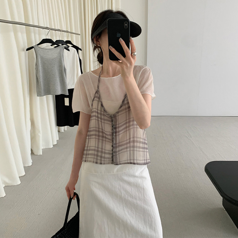 Atasan Model Baru Musim Panas 2025 TG Setelan Dua Potong Kemeja Kecil Gantung Leher Tali Kotak-kotak Segar Baru TG 24949